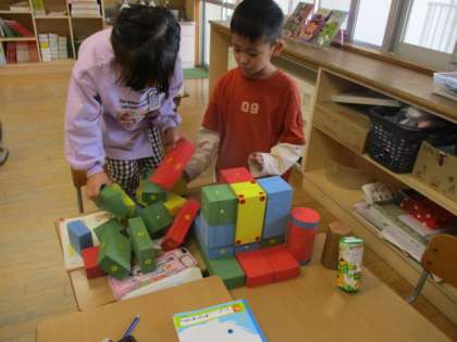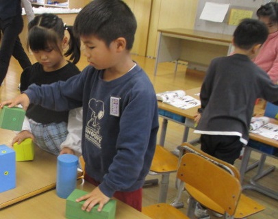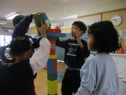 いろいろなかたちの積み木を使って、かたちあそびをしました。遊んでいく中で、より高いタワーを作ることに夢中になっていき、どんな形を使ったら、高く積み上げられるか考えながら学習を進めていました。