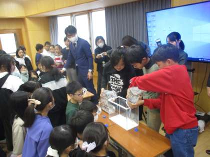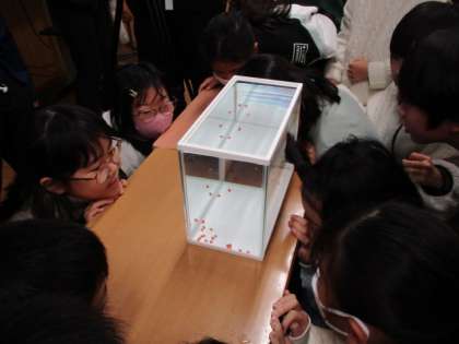 富山市農林水産課の方をはじめ11名の方にお越しいただき、サクラマスの生育や放流についてお話をしていただきました。その後、サクラマスの卵をいただき、水槽に移しました。これからみんなでお世話をがんばります。