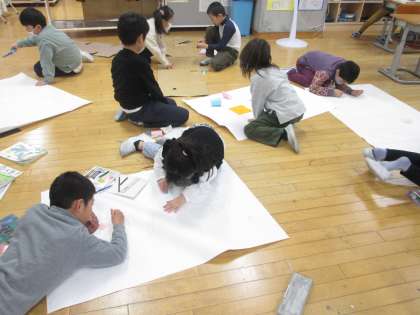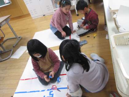 生活科の学習で、うごくおもちゃを作っています。そのおもちゃで一年生さんと遊びたいと、みんなで力を合わせておもちゃランドを作っています。「一年生さんが楽しめるように、カラフルにしたいな」「点数が書いてある的にしたら、わくわくするかも」など、一年生のためにどうすればよいかを友だちと考えながら作っています。