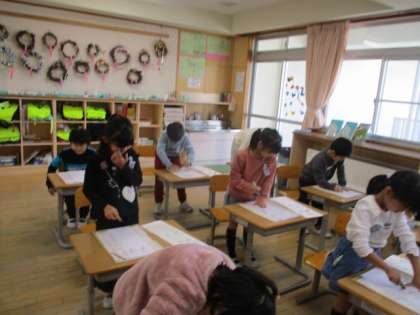 硬筆墨を使った書き初めに取り組んでいます。大きく、濃く、力強い字を目指して真剣に取り組んでいました。