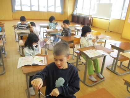 音楽の時間にトライアングル、タンブリン等の楽器に触れました。色々な楽器を楽しみながら演奏し、音色に親しみました。