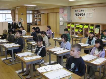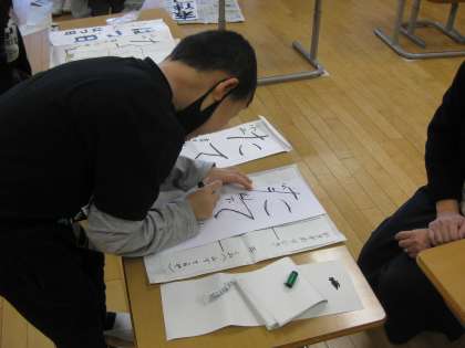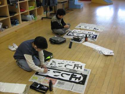書く準備を整え、心を落ち着かせ、静かな中、校内放送から書写担当の先生の穏やかで背筋が伸びるような語り口の声が響きました。その先生のお話が終わると、静かな教室で、子供たちは一斉に硬筆墨、墨汁を書初用紙に、、、。