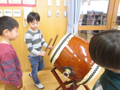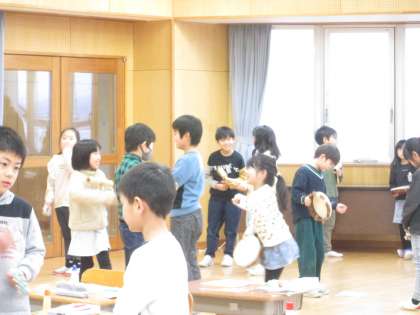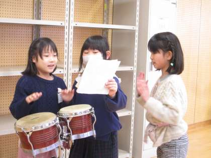 音楽科の学習で、いくつかのリズムの中から好きなリズムを選び、自分だけのオリジナルソングをつくっています。自分だけのソングを、いろいろな楽器で演奏しました。「大太鼓でならすとお祭りみたいで好きだな」「トライアングルを使うと、きれいな音色になるよ」など、楽器の特徴を生かしながら、活動を楽しんでいます。