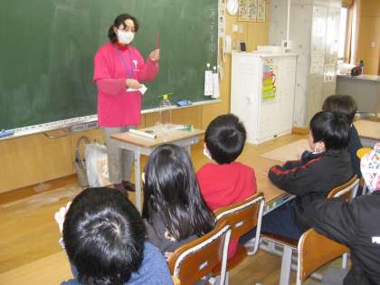 Nボランティアさんは、いつも読み聞かせの後、恒例の実験も見せてくださいます。今の時期、よく起こる現象「静電気」を発生させ、おもちゃにして遊ぶところを見せてくださいました。