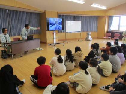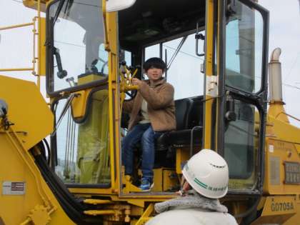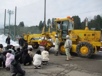 富山土木センター道路施設課の方が来てくださり、富山の雪の様子や除雪作業について教えていただきました。また、実際に大きな除雪車に乗せてもらいました。子供たちは、たくさんの操作レバーやスイッチに驚いていました。