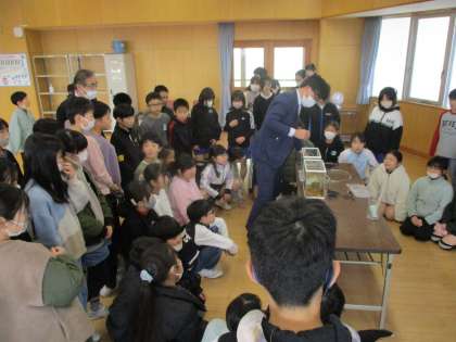 11月下旬よりお世話をしていたサクラマスを、漁業共同組合の方にお預けしました。サクラマスを育てた感想を伝え、楽しい歌も披露しました。帰ってくるのは4年後だそうです。それまで元気でいてね!