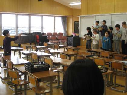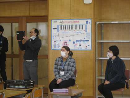 今日は、外国語活動でおせわになったALTの先生と、外国語活動の先生に、その音楽でつくった合奏を見ていただこうと、業間に、音楽室に来ていただき、合奏と歌を聴いていただきました。