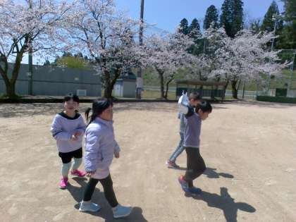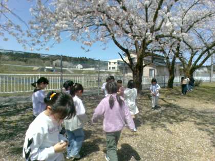 生活科の学習で春を見つけにグラウンドへ行きました。桜や、チューリップ等を見つけて楽しんでいました。