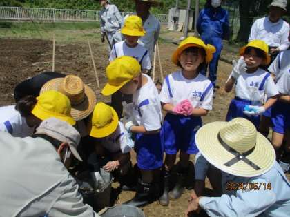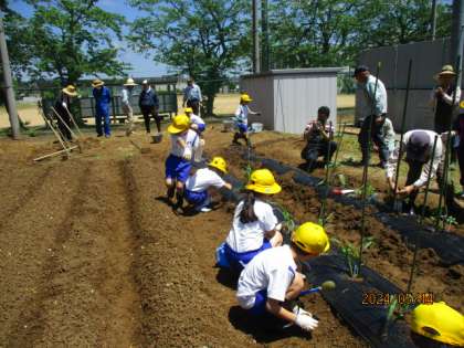 老人クラブの皆さんと一緒に畑に野菜の苗を植えました。植え方のこつを教えてもらいながら、しっかりと苗を植えることができました。これから育てる野菜に一段と意欲をもつ子供達の様子が見られました。老人クラブの皆様、ご協力、本当にありがとうございました。