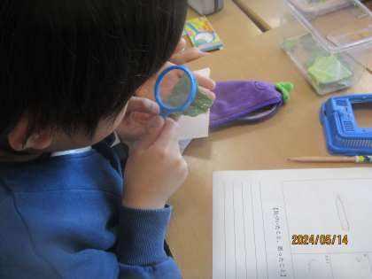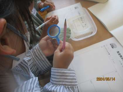 今日の理科の学習では、モンシロチョウの幼虫「アオムシ」の観察を行いました。子供たちはアオムシをきれいな成虫にしたいと願い、班の仲間と役割分担をしながら、責任をもって育てていこうと話し合っていました。