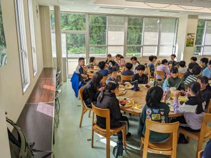宿泊学習の二日目がスタートしました。おいしい朝ご飯を食べ、このあとの活動をがんばります!
