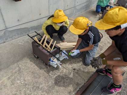 カレーライスづくりのために、かまどを使って調理をする準備をしています。
