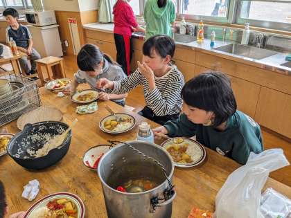 自分たちでつくったカレーライスを、グループごとに食べました。