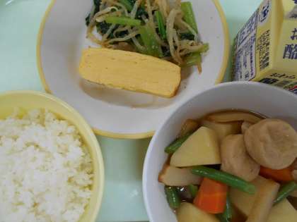【今日の献立】 ごはん 牛乳 厚焼き卵 小松菜のごま和え 関東だき