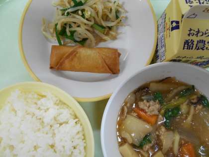 【今日の献立】 ごはん 牛乳 春巻き 塩ナムル 八宝菜
