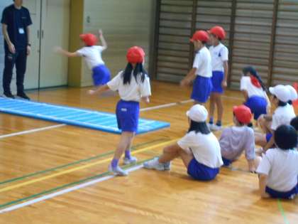 3・4年生が一緒に新体力テストに取り組みました。画像は立ち幅跳びの様子です。