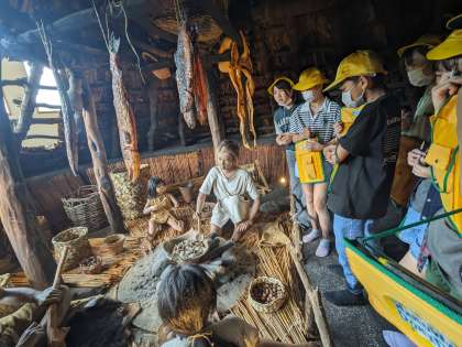竪穴式住居の中に入って、当時の暮らしについて学びました。