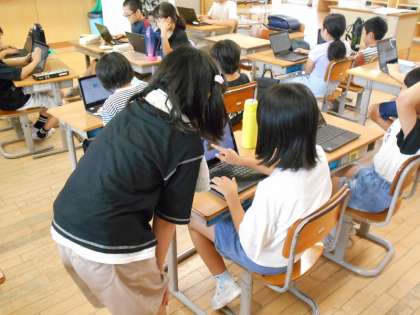 環境問題について、調べたことをもとにスライド作成に取り組んでいました。