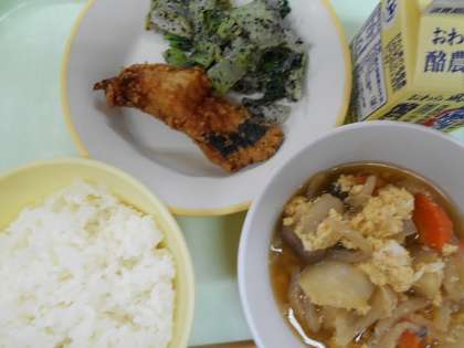 【今日の献立】 ごはん 牛乳 魚の竜田揚げ よごし 卵とじ