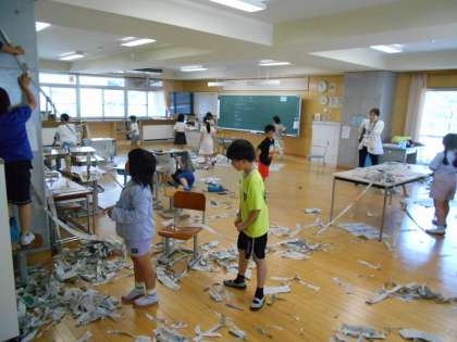 新聞紙を切って、つないだり、つるしたりしながら造形遊びを楽しんでいました。