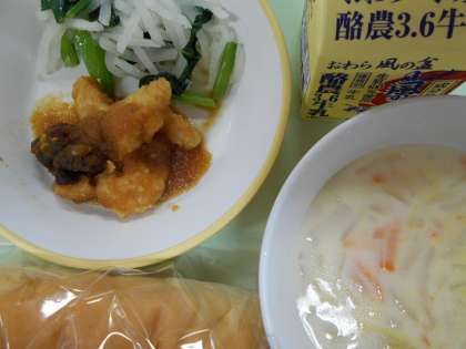 米粉コッペパン 牛乳 鶏肉とレバーのりんごソースからめ 大根サラダ ビーンズポタージュ