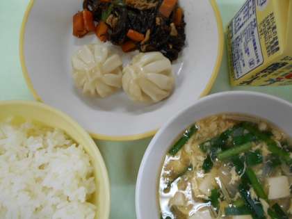 【今日の献立】 ごはん 牛乳 えび包子 もずくのチャプチェ にら玉汁