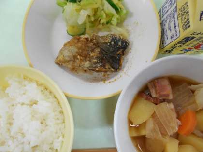 ごはん  牛乳  魚の梅風味かば焼き  あわせ和え  ベーコンとじゃがいもの煮物