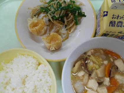 ごはん 牛乳 にんじんシューマイ ナムル えびと豆腐のうま煮