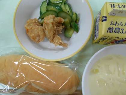 コッペパン 牛乳 フライドチキン アスパラサラダ コーンポタージュ