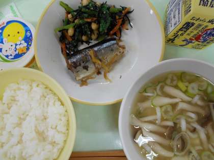 ごはん 牛乳 さんまの生姜味 大豆とひじきのごま和え 団子汁 お月見ゼリー