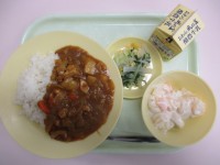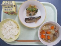 【今日の献立】 ごはん 牛乳 魚のかば焼き 梅肉和え 沢煮椀