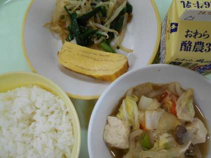 【今日の献立】 ごはん 牛乳 厚焼き卵 香味和え 肉豆腐