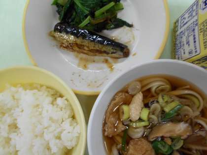 ごはん 牛乳 いわしの土佐煮 とろろ昆布和え きつねうどん
