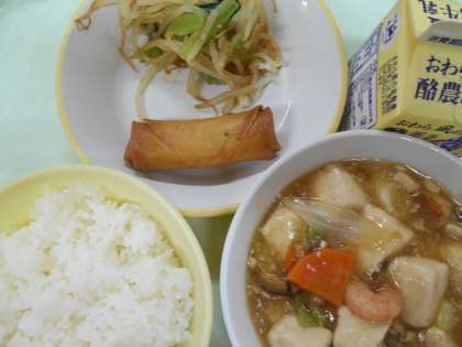ごはん 牛乳 春巻き 小松菜のごまびたし えびと豆腐のうま煮