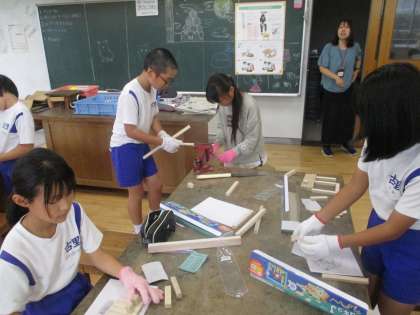 のこぎりで木を切って作品をつくっています。学校で初めてのこぎりを使いましたが、友達と協力することで上手に木を切ることができました。