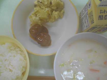 ごはん 牛乳 ミートボール チーズおさつ 豆乳野菜スープ