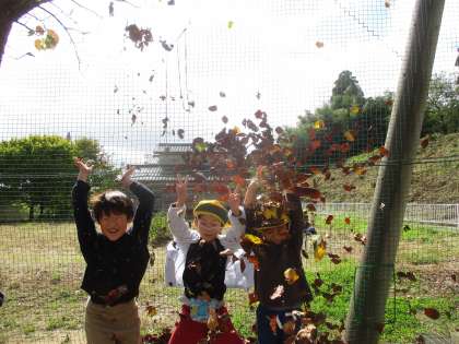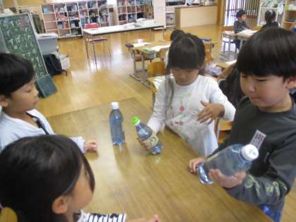算数科の学習ではペットボトルに入っている水の量を比べる方法を考えています。生活科の学習では落ち葉や風と遊んで秋に親しんでいます。