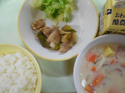 ごはん 牛乳 あっさりチキン ゆでキャベツ 秋の香りシチュー