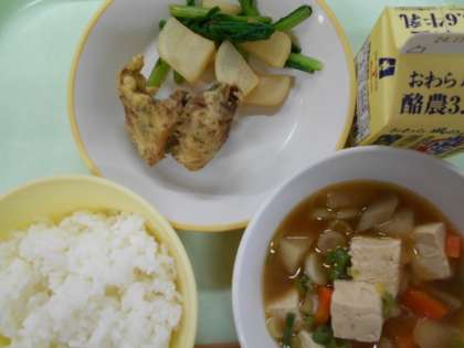 【今日の献立】 ごはん 牛乳 魚のえごま揚げ かぶの色どり 根菜汁