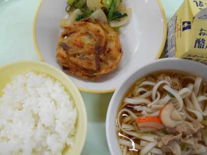 ごはん  牛乳  野菜かき揚げうどん  やちゃら