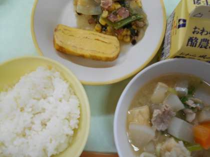 ごはん  牛乳  厚焼き卵  野菜のオイスターソース炒め  豚汁