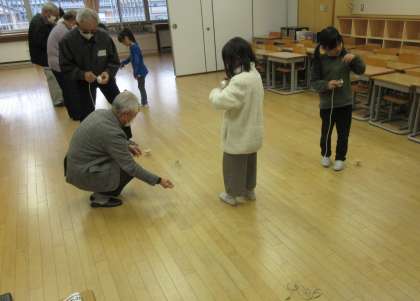老人クラブの方々に「昔からの遊びの名人」として、こま回しやおはじき、メンコや竹馬等の様々な遊びのコツを教えていただきました。