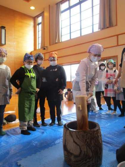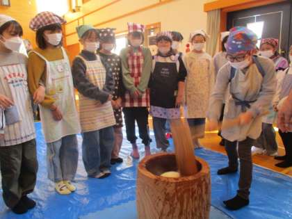 今日は地域の皆様のご支援の下、公民館で餅つきを体験しました。