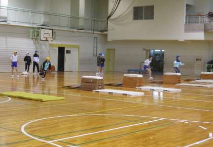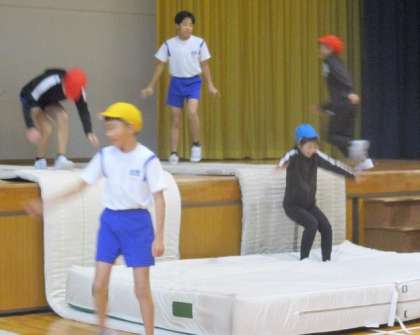 体育科では、できるようになりたい技をペアを組んで活動しています。動画を撮って手本と見比べたり、互いにアドバイスし合ったりしながら技の完成を目指しています。