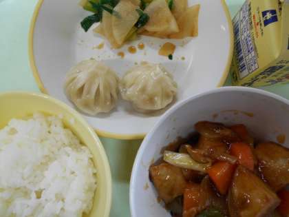 【今日の献立】 ごはん 牛乳 えび包子 大根のナムル 酢豚