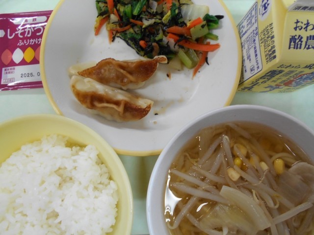 ごはん  牛乳  焼きぎょうざ  鉄たっぷりサラダ  サッポロラーメン  しそかつおふりかけ