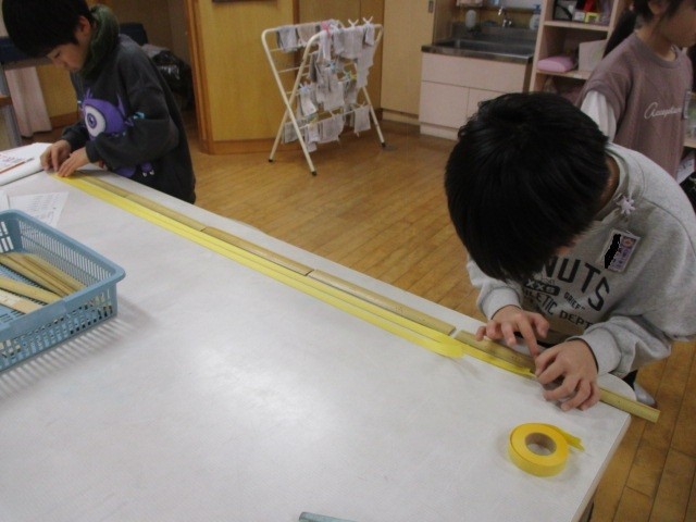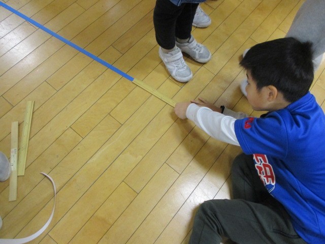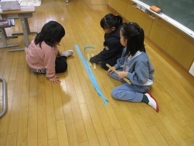 1月29日(水) 2年生算数科「長いものの長さのたんい」 公開日 2025/01/29 更新日 2025/01/29 2年生 「長いものの長さのたんい」の学習が始まりました。今日は、自分が両手を広げた長さを測りました。今まで使っていた30cmものさしでは長さが足りなかったため、30cmものさしを何本もつないで測っていました。 +1