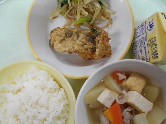 ごはん 牛乳 ホキの利久揚げ もやしのおひたし 豚汁
