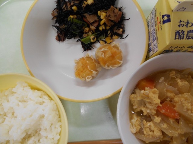 ごはん  牛乳  にんじんシューマイ  ひじきとコーンのソテー  卵とじ