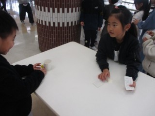 「2年生の作ったおもちゃの仕組みを知りたい」「2年生になったら、自分たちもするかもしれないからどんな風にするのかよく見たい」と、わくわくしながら、動くおもちゃ大会に参加しました。たくさん遊び、2年生のよさを見つけて満足した様子でした。